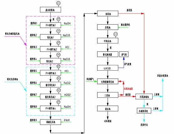 污水先PH调节池,然后在经过氧化池,这样来回的重复几个流程,在进入PAM反应池,然后经过沉淀,使排放出去的水能够达标。其具体的流程图如下。