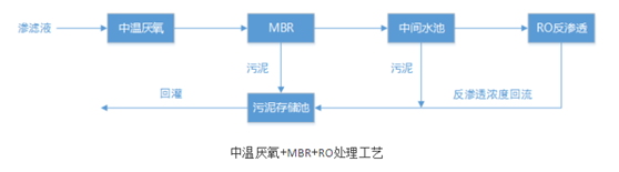 渗滤液通过调节池流入到中温厌氧池,经大分子有机污染物降解后进入缺氧段MBR反应器中,与回流水混合进入好氧段MBR进行曝气,去除渗滤液中的TN,好氧池出水进入MBR分离器,将分离的污泥浓液回流至MBR缺氧段,MBR出水进入反渗透系统,渗滤液经反渗透处理后实现达标排放。