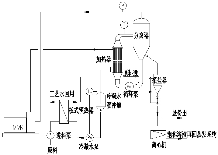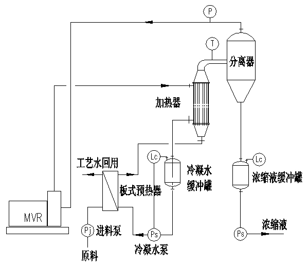 1、对于在蒸发过程中无结晶时,系统比较简单,系统由预热器、蒸发器(可以采用升膜式或降膜式)、分离器、MVR压缩机和接收罐组成(如下图)再配出料泵及控制部分,组成一套完整的MVR蒸发器系统;蒸发可以是常压或负压,根据物料的特性而定,负压蒸发时要考虑出料泵的汽蚀余量克服系统的真空。
